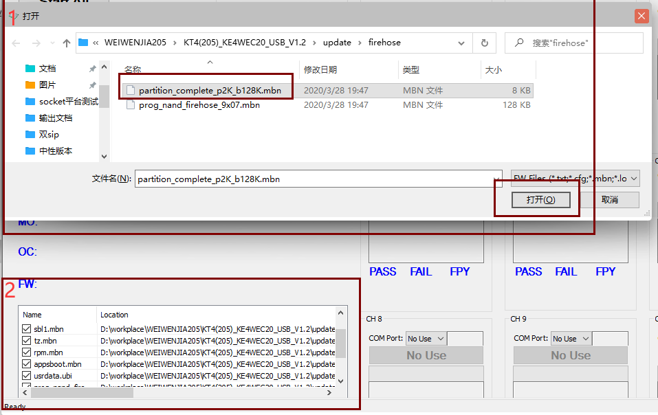 2)随后会弹出升级文件选择窗口,选择“五卡话机升级包”文件夹,按照以下路径选择文件“update\firehose\partition_complete_p2K_b128K.mbn”,软件左下角会弹出如下图中 2 部分圈出的文件列表, 请确认路径(文件位置)正确。