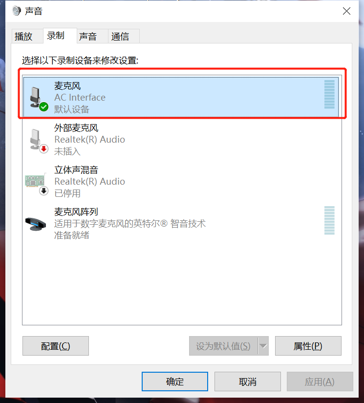 3、查看声音设置中扬声器和麦克风是否为AC Interface,若不是默认的需要设置为默认。