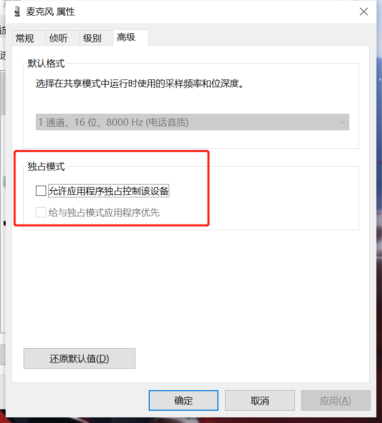 5、取消**扬声器和麦克风**属性高级里面的独占模式。