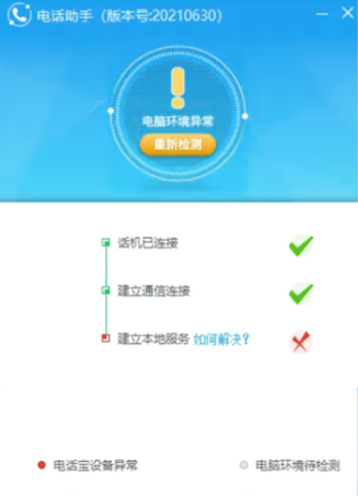 ## **使用电话宝打开电话助手提示【建立本地服务失败】**