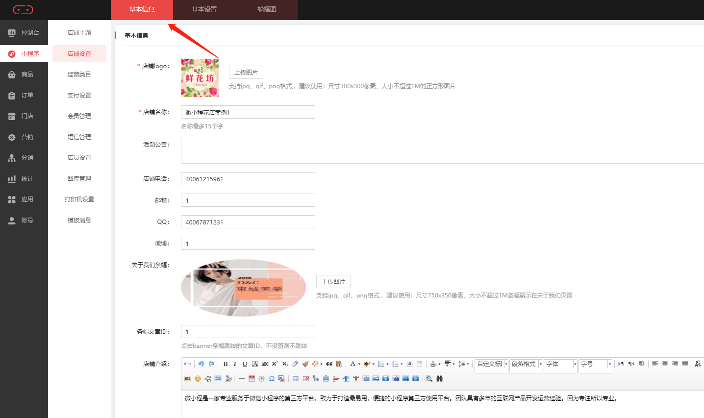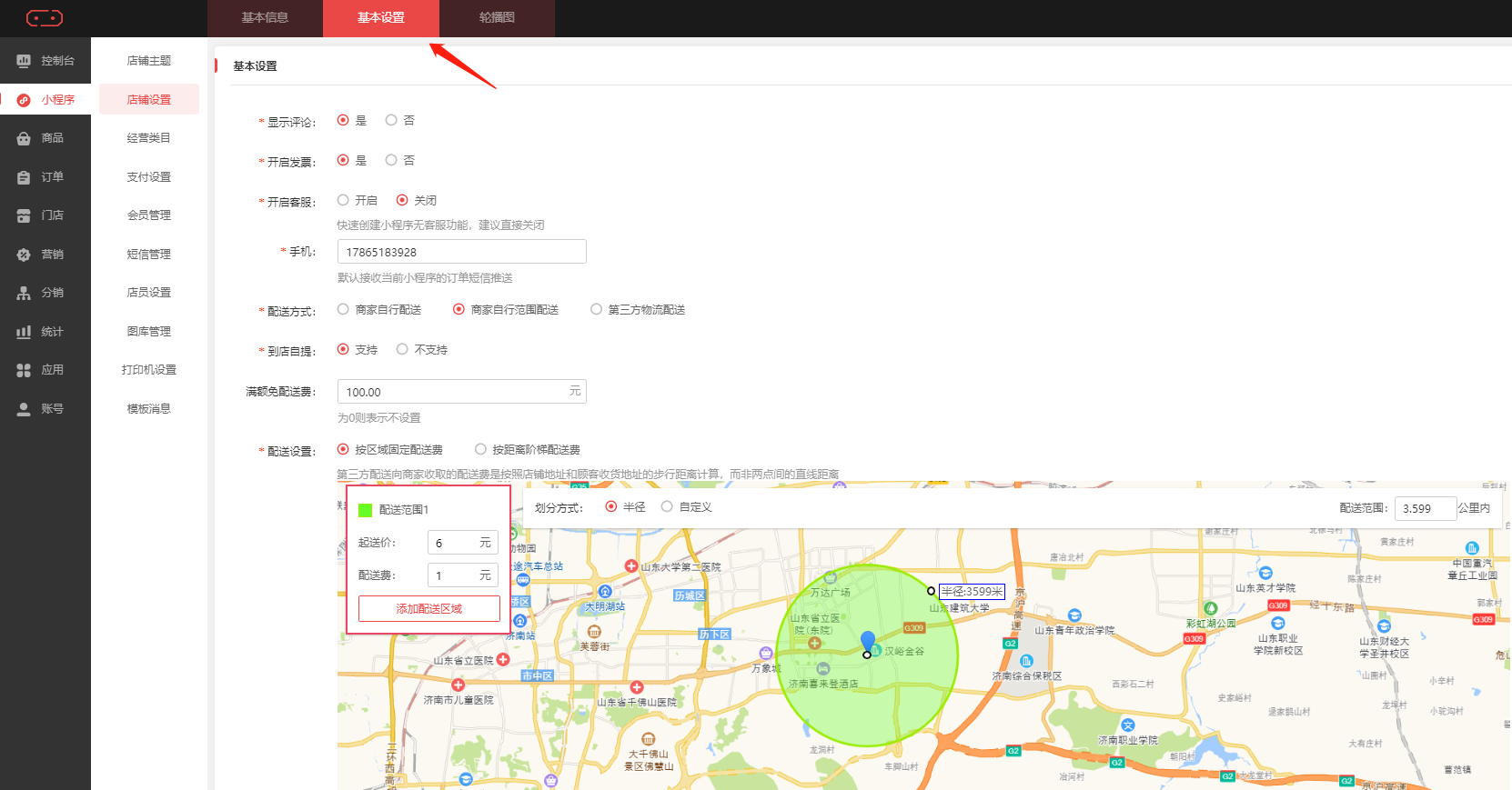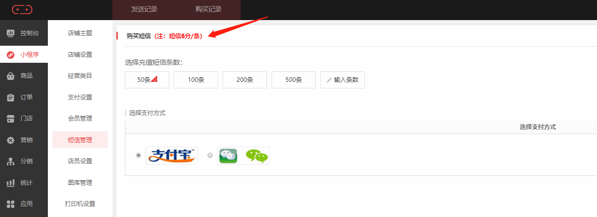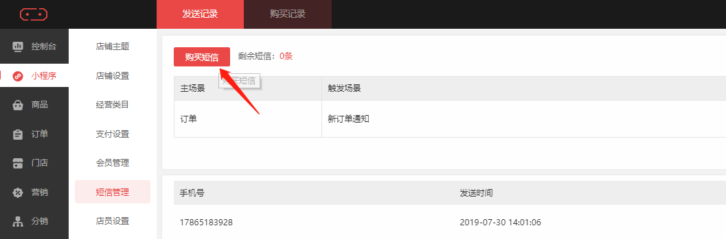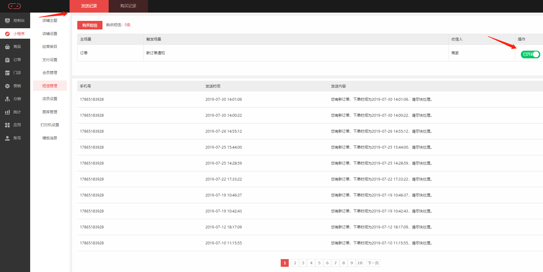 ### **8.小程序--短信管理(小程序--店铺设置--基本设置--手机号 填写手机号之后,用户下单后商家可以收到短信提醒)**