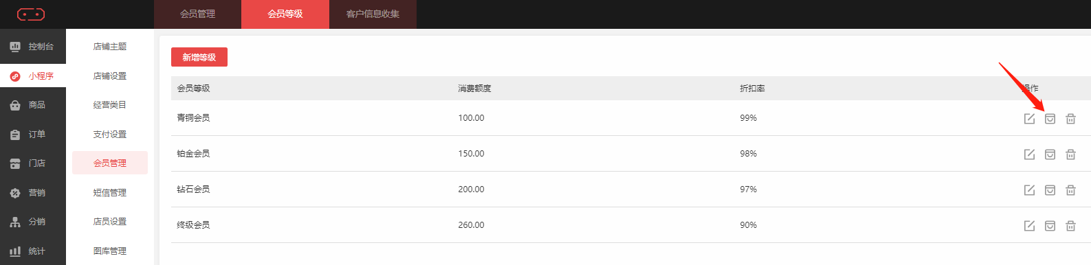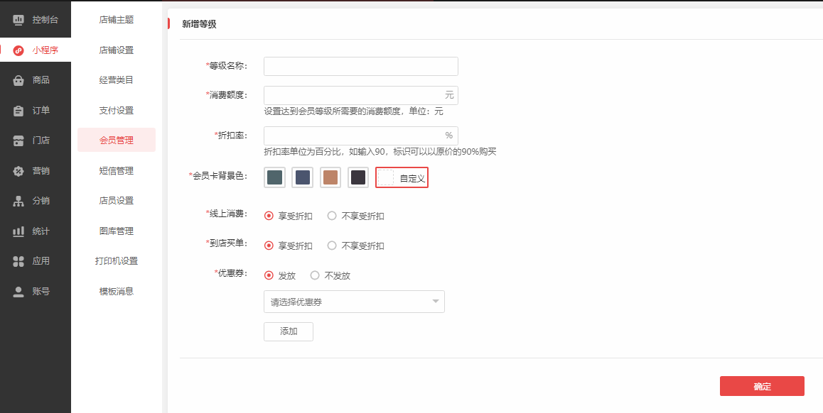 #### 新增等级(注:优惠券的发放需要先在“营销--优惠券”功能添加)