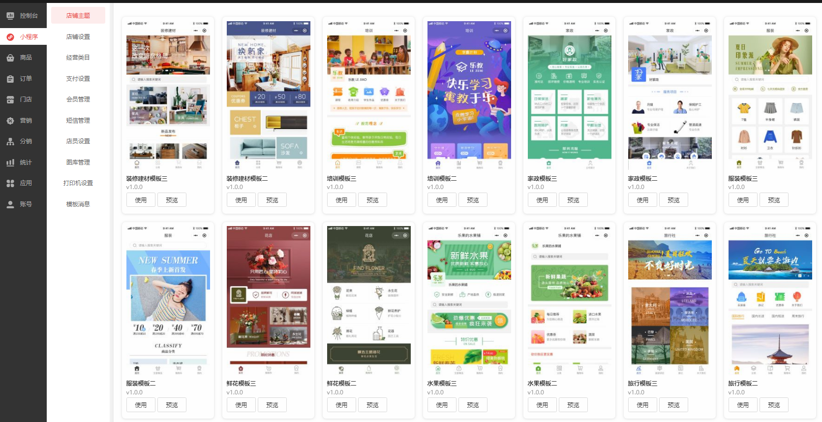 ### **1.首次进入后台,需要先在小程序--店铺主题--选择对应的模板开始制作小程序**