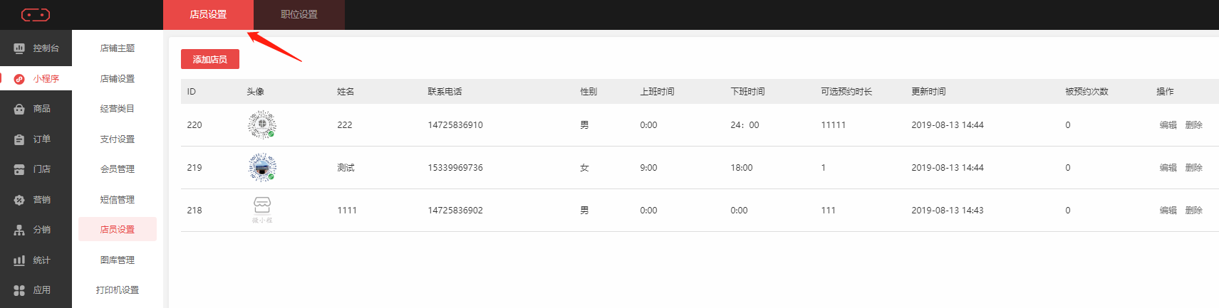 ### **10.小程序--店员管理--店员设置--添加店员(添加店员是用于预约功能的)**
