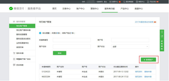 点击服务商功能-新增商户,录入商户签约微信支付的资料,等待审核(审核时间1-5天);
