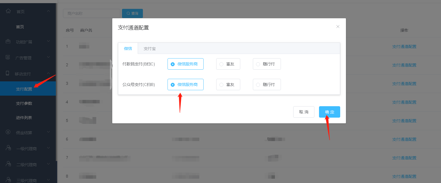 移动支付-支付配置-对应商户-支付通道配置-微信全选-确定