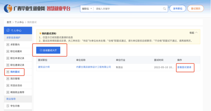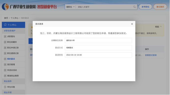 点击【查看面试邀请】,打开面试邀请页面如图: