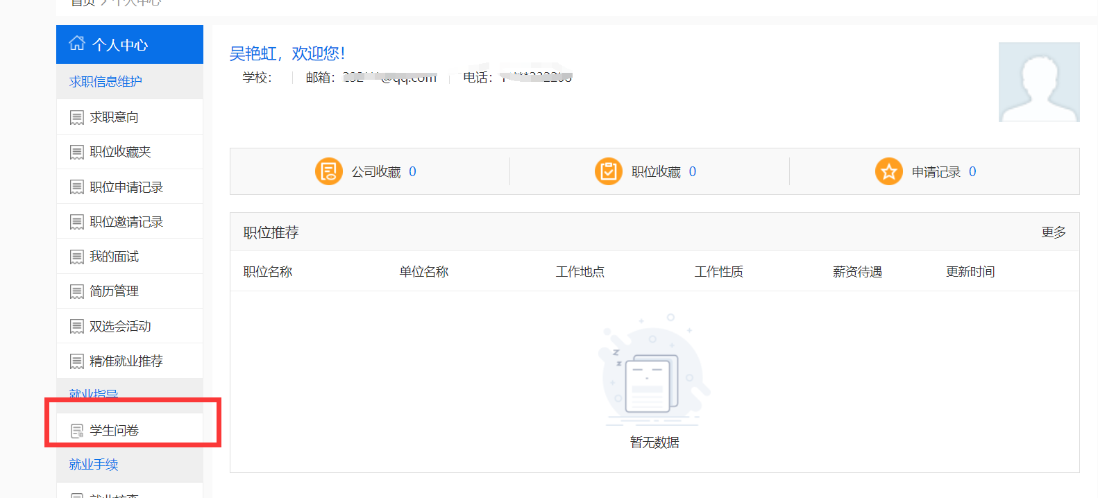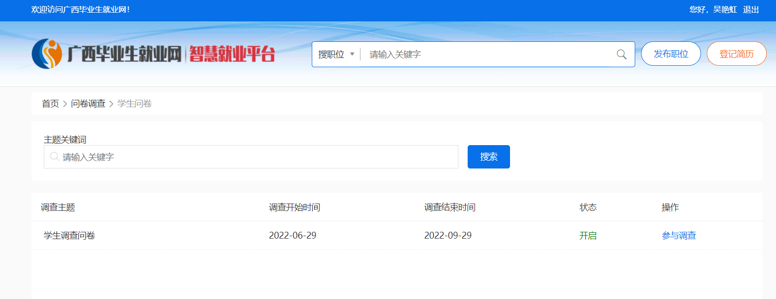 **11.1学生问卷** 点击【学生问卷】,进入后操作下可点击【参与调查】如图: ![](https://img.kancloud.cn/96/f8/96f82c7a1c92710eb2d603f48b8a57a7_1582x718.png) ![](https://img.kancloud.cn/69/14/6914f6353c38691984f464fabf916d99_1593x614.png)