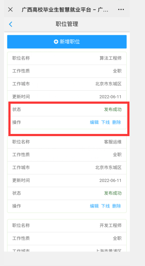 按照系统提示,进行职位信息填写,确认无误后点击【提交】,职位便提交到广西就业网和所有入驻的学校,只有省级和学校审核通过,才能相关就业网上展示。提交成功的职位如图: