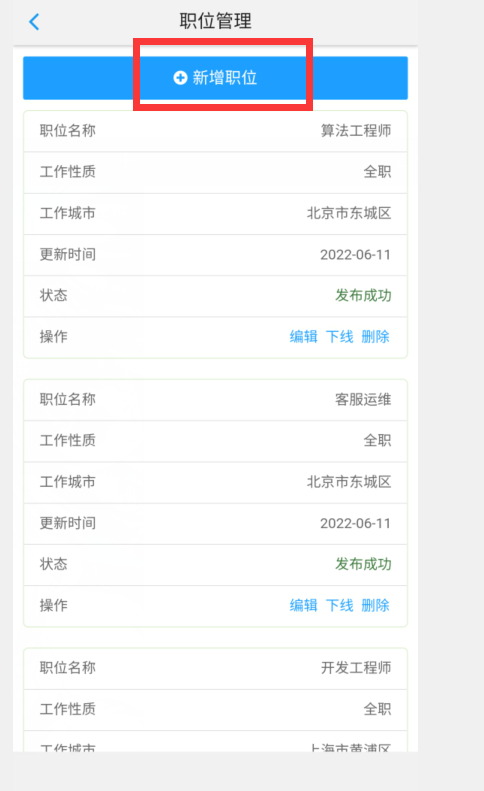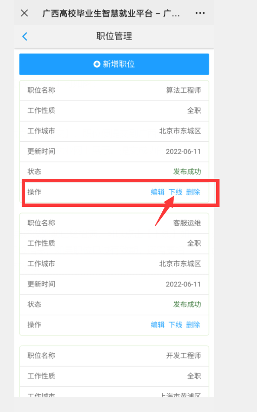 发布成功的职位,系统默认有效期为1个月,如果还没到期已经招满,可以点击【下线】如图,下线的单位,浏览者将无法在查看到该条职位信息;如果职位已过有效期,还需要招聘,可以点击【上线】,将职位延长一个月的有效期。