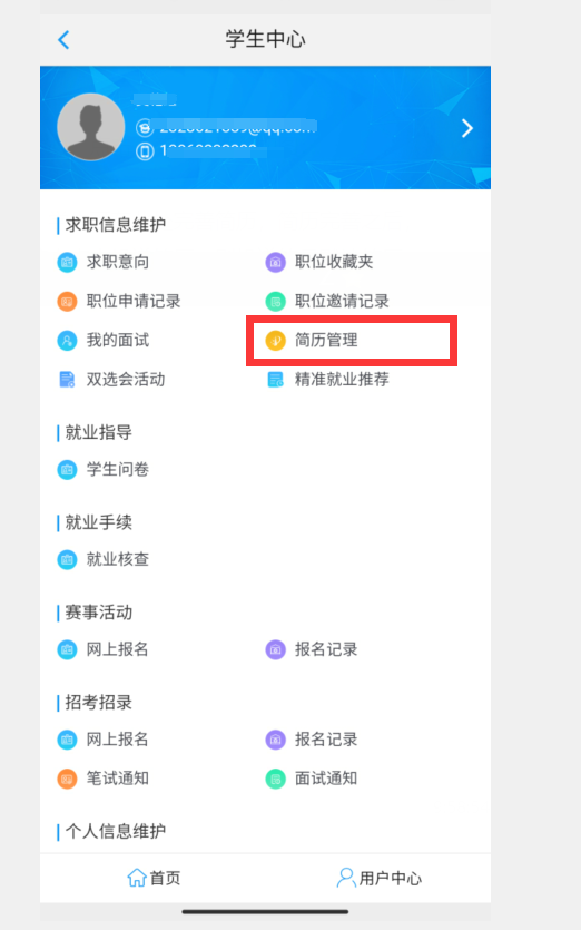 学生在学生中心,可以制作管理简历,在学生中心,点击【简历管理】如图: