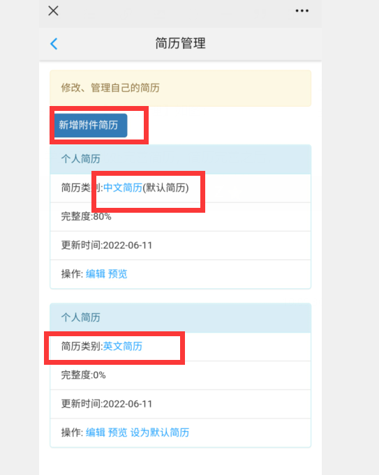 学生简历包括中文简历、英文简历、附件简历;学生可在此处完善简历,简历完善之后,将需要投递的简历设置为默认简历;学生在系统中点击投递简历,则投递的是默认简历;