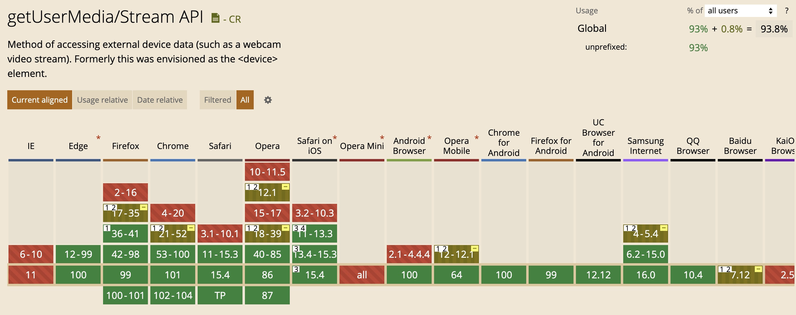 `getUserMediaAPI` 是 H5 为我们提供的新的 API。该 API 最早是直接挂在 `navigator` 对象上面的,但是目前做了调整,`navigator.getUserMediaAPI` 已经被废弃,取而代之的是 `navigator.mediaDevices.getUserMedia`。