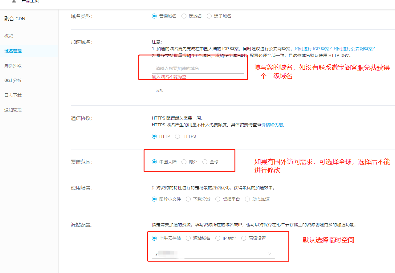 ## 六、绑定CDN域名,由于七牛云给的临时域名只能用一个月,建议绑定,如果没有域名,可联系微宝阁服务人员赠送一个二级域名。