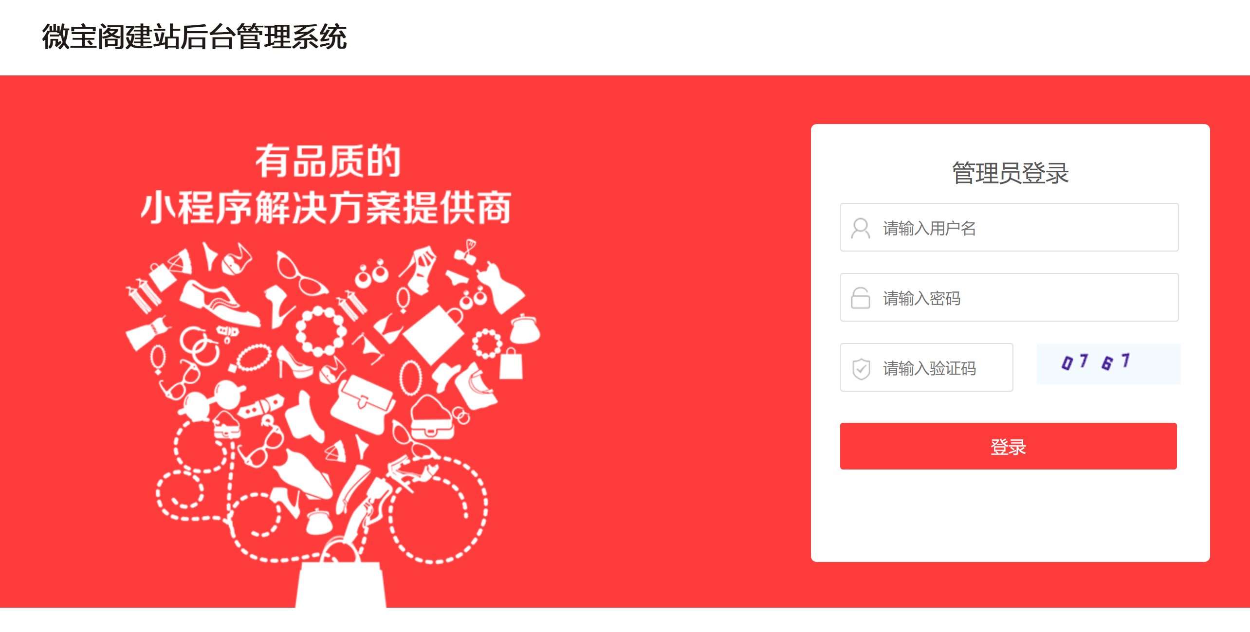 #### 1.点击登录[微宝阁建站后台](https://gw.weibaoge.cn/admin/index.php?s=/admin/login/index.html& "微宝阁建站后台"),输入微宝阁后台账号密码([不知道账号密码点击,知道可忽略](https://www.kancloud.cn/wiotweixin/tiyan/847881 "不知道账号密码点击,知道可忽略"))