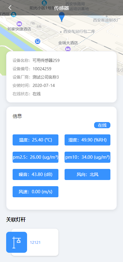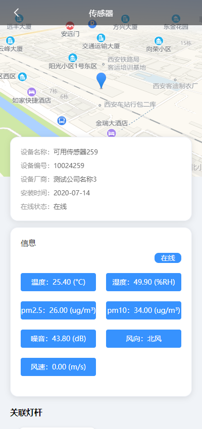 最上方是传感器绑定的灯杆所在的地图定位,然后是传感器的详细信息,信息中可以看到传感器的环境监测信息,最下方关联灯杆会显示传感器绑定的灯杆,点击则可进入对应灯杆的详情页面。