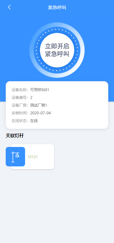 可以看到当前紧急呼叫的详细信息,最下方关联灯杆会显示紧急呼叫绑定的灯杆,点击则可进入对应灯杆的详情页面。