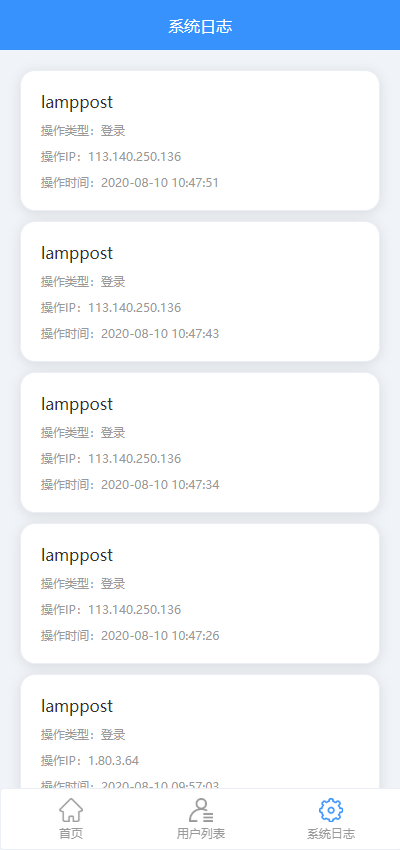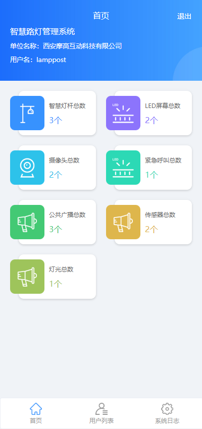 如图,从上往下,右上角可以退出当前账号,下面是当前账号的一些信息,然后是当前账号下智慧灯杆及所有设备的数量卡片,点击可进入对应设备列表,底部可以查看用户列表和系统日志信息。
