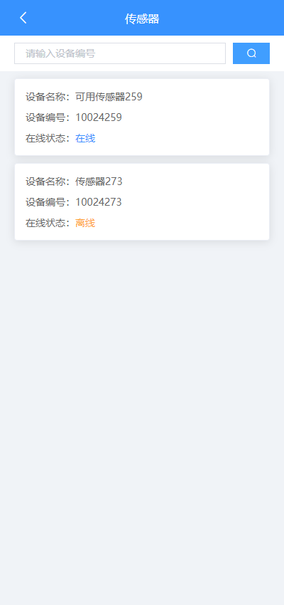 如图,点击首页传感器卡片进入传感器列表,可以查看到当前账号下所有的传感器信息,在搜索栏输入设备编号可以模糊查询出与之匹配的设备信息,点击想要查看的传感器信息可以进入到传感器详情页面,如下图: