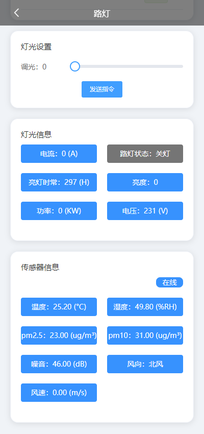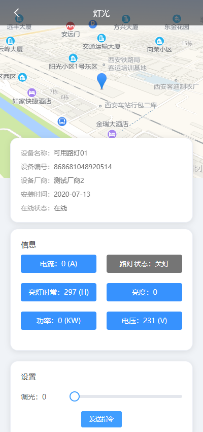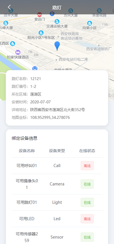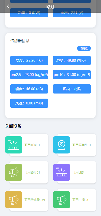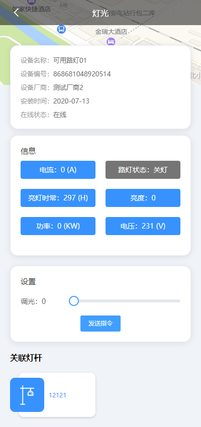 最上方是灯杆所在的地图定位,然后是灯杆的详细信息、绑定的设备信息,如果绑定了路灯设备则可以在灯光设置进行路灯的调光,可以看到绑定的灯光信息,如果绑定了传感器则可以看到传感器的信息,最下方关联设备会显示与灯杆关联的所有设备,点击则可进入对应设备的详情页面。
