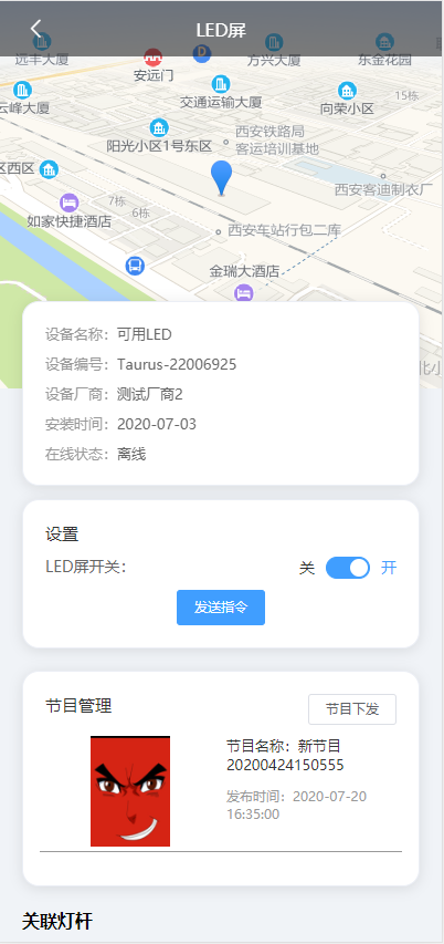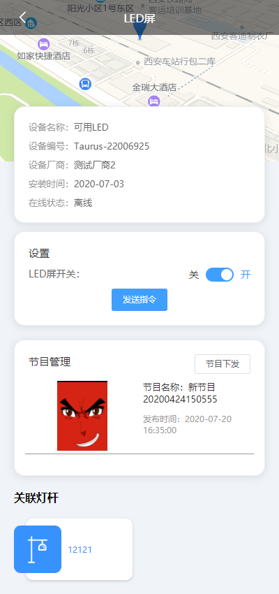 最上方是LED屏绑定的灯杆所在的地图定位,然后是LED屏的详细信息,设置中可以控制LED屏的开关,节目管理会显示LED屏的节目信息,选择节目信息然后点击节目下发可以将选择的节目下发到LED屏幕显示,最下方关联灯杆会显示LED屏绑定的灯杆,点击则可进入对应灯杆的详情页面。