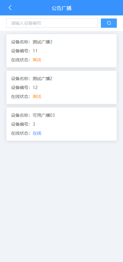 如图,点击首页公共广播卡片进入公共广播列表,可以查看到当前账号下所有的公共广播信息,在搜索栏输入设备编号可以模糊查询出与之匹配的设备信息,点击想要查看的公告广播信息可以进入到公告广播详情页面,如下图: