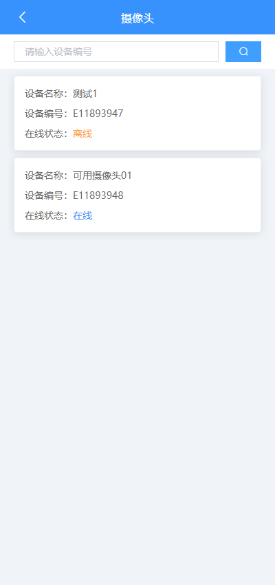 如图,点击首页摄像头卡片进入摄像头列表,可以查看到当前账号下所有的摄像头信息,在搜索栏输入设备编号可以模糊查询出与之匹配的设备信息,点击想要查看的摄像头信息可以进入到摄像头详情页面,如下图: