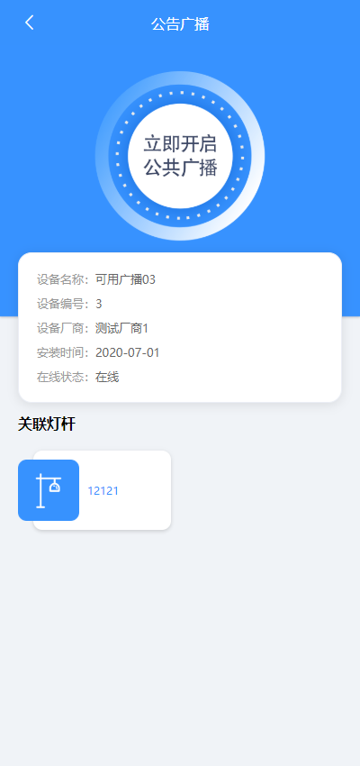 可以看到当前公告广播的详细信息,最下方关联灯杆会显示公告广播绑定的灯杆,点击则可进入对应灯杆的详情页面。