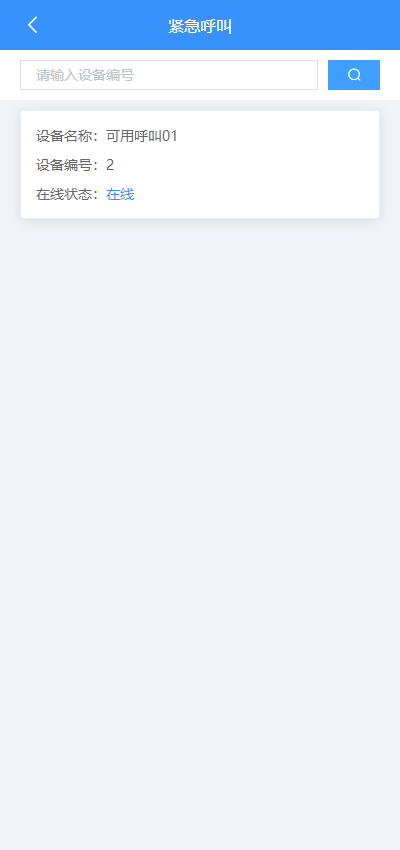 如图,点击首页紧急呼叫卡片进入紧急呼叫列表,可以查看到当前账号下所有的紧急呼叫信息,在搜索栏输入设备编号可以模糊查询出与之匹配的设备信息,点击想要查看的紧急呼叫信息可以进入到紧急呼叫详情页面,如下图: