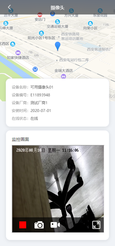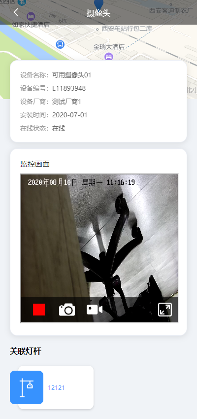 最上方是摄像头绑定的灯杆所在的地图定位,然后是摄像头的详细信息,监控画面中可以实时看到摄像头的画面,最下方关联灯杆会显示摄像头绑定的灯杆,点击则可进入对应灯杆的详情页面。