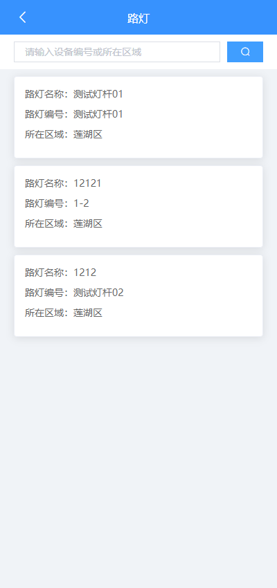 如图,点击首页智慧灯杆卡片进入智慧灯杆列表,可以查看到当前账号下所有的灯杆信息,在搜索栏输入区域、灯杆编号可以模糊查询出与之匹配的灯杆信息,点击想要查看的灯杆信息可以进入到灯杆详情页面,如下图: