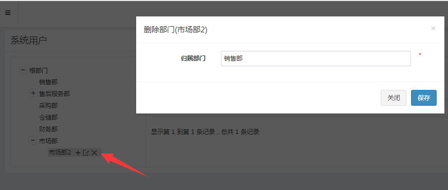 点击需要删除的部门,选择删除按钮,部门删除时需要转移当前部门下面所有用户