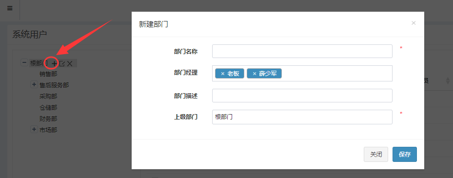 点击新建部门按钮弹出部门设置界面