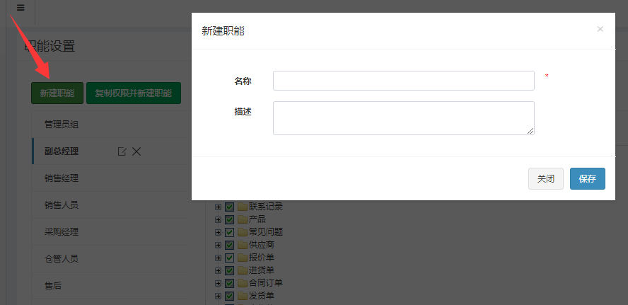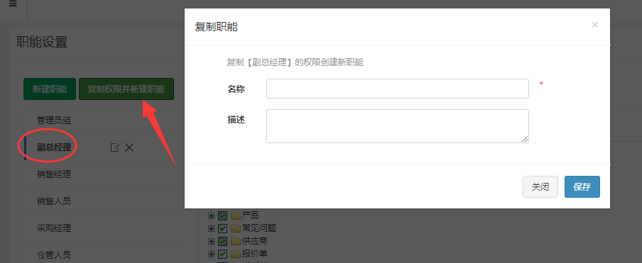 也可以选择复制权限并新建职能,前提是复制已有的职能,复制的职能权限是一样的