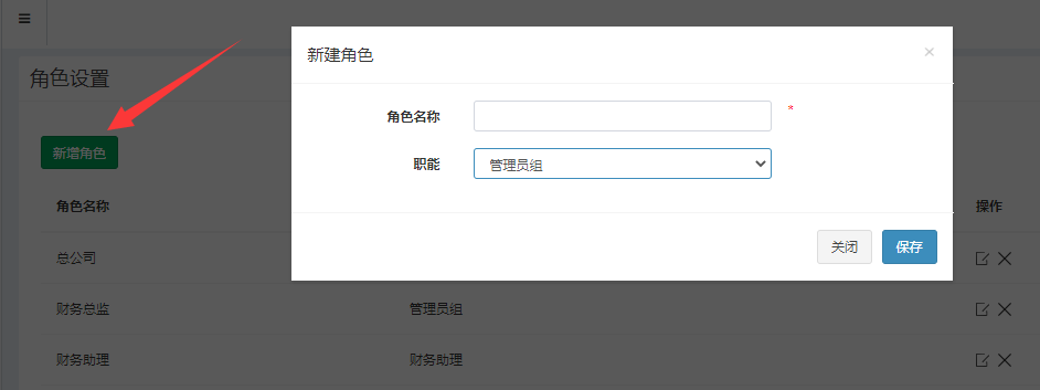 点击新增角色,在设置角色前需要先设置好职能,弹出角色设置界面,填写角色然后选择对应的职能