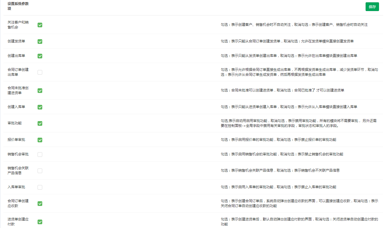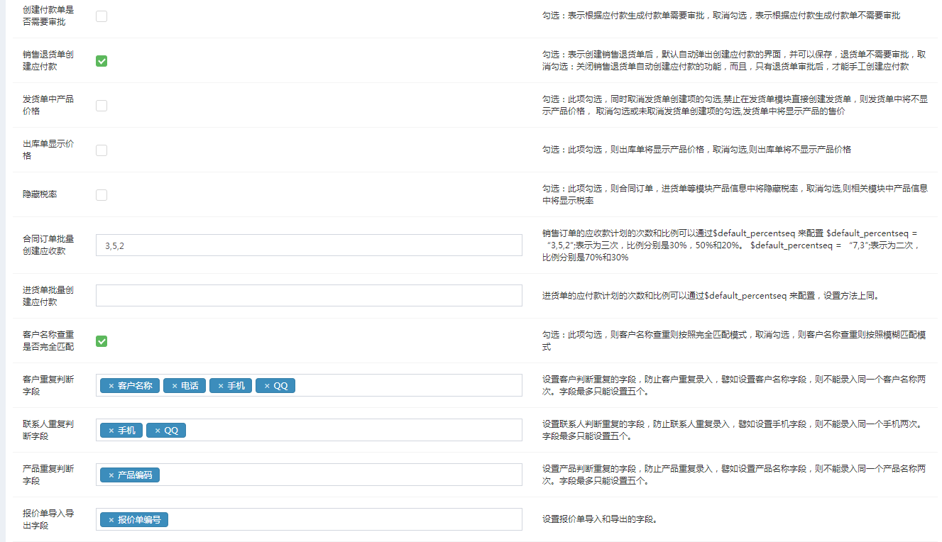 管理员要在基本设置>系统配置>系统参数里面可以配置客户的查重字段、合同的导入导出字段、小数点位数、是否开启审批等