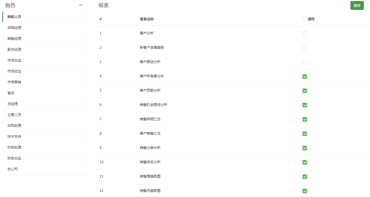 管理员根据公司需求选择不同的角色隐藏报表查看权限,取消勾选表示当前用户无权限查看这个报表