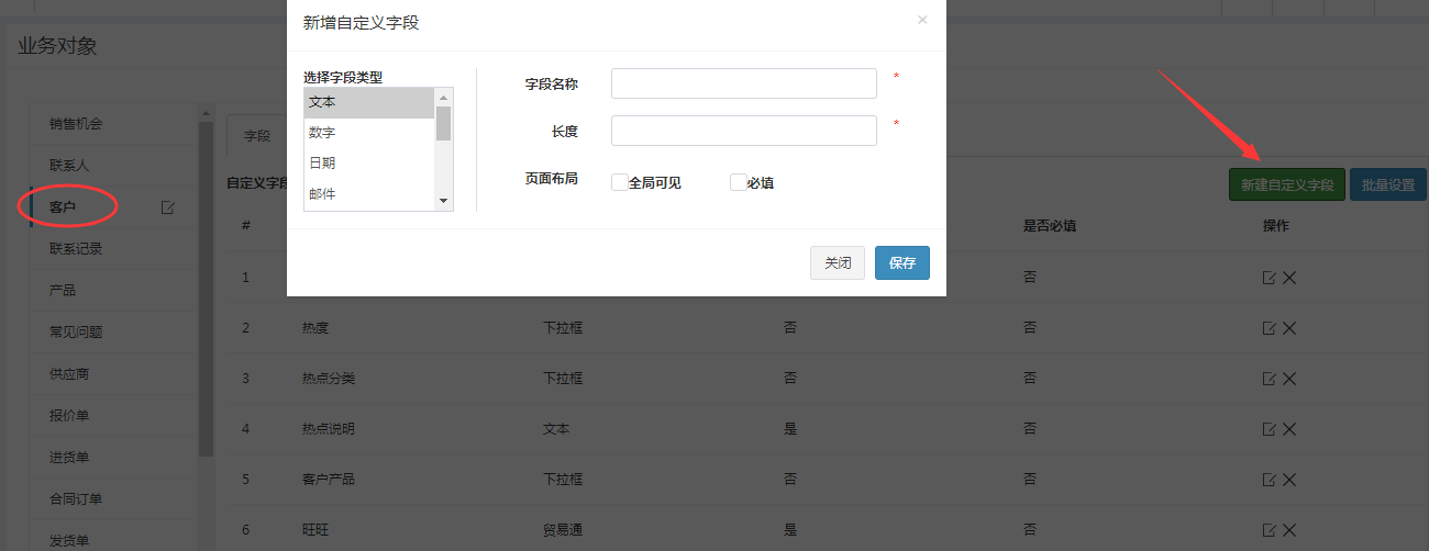 系统定制>业务对象,选择模块客户,点击新建自定义字段按钮