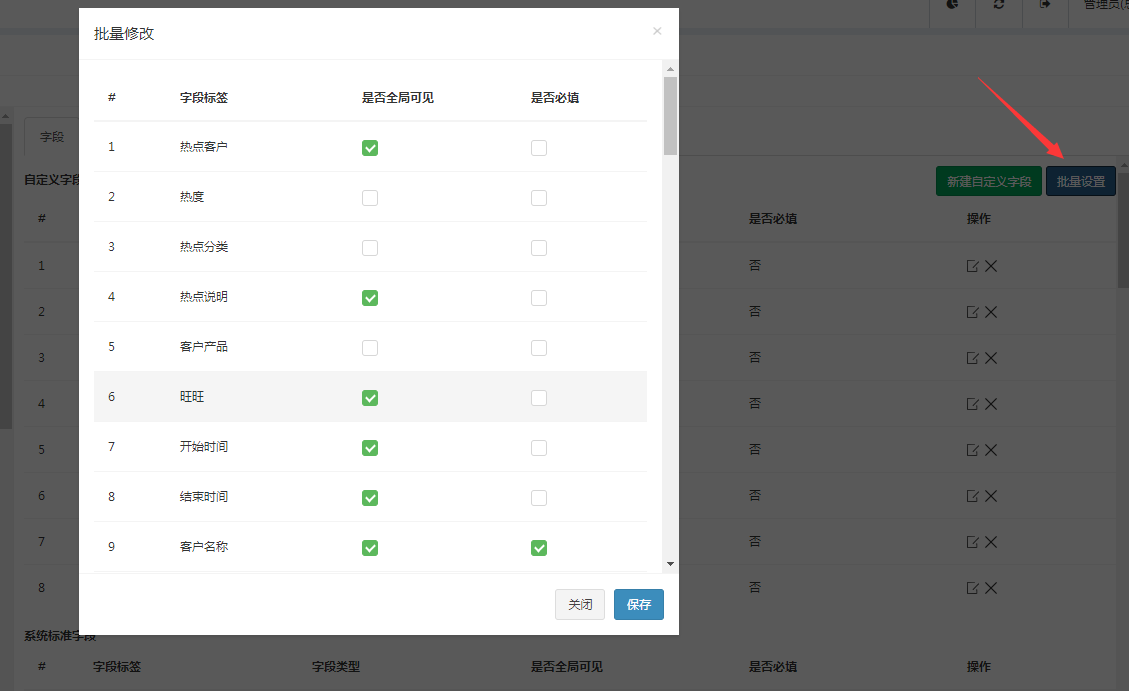 右侧可以点击批量设置按钮,批量设置字段是否全局可见,是否必填。