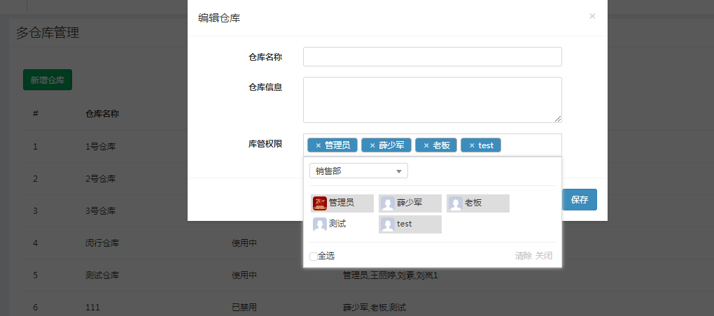 新建仓库的操作如下:录入仓库名称,勾选仓库的使用者,未勾选的用户将不能使用该仓库。