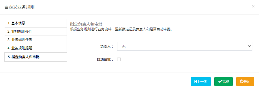基本信息>业务规则条件>业务规则任务>业务规则提醒>指定负责人和审批