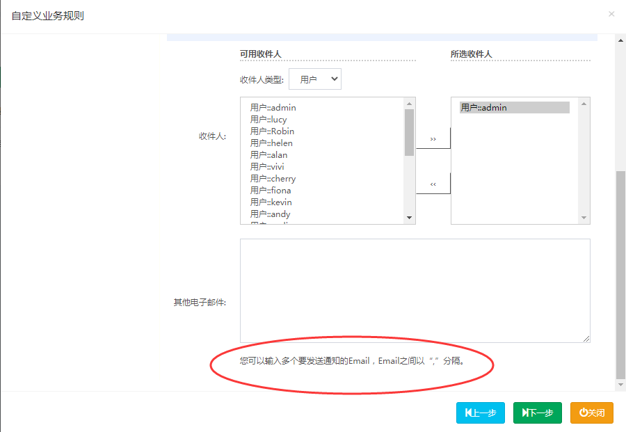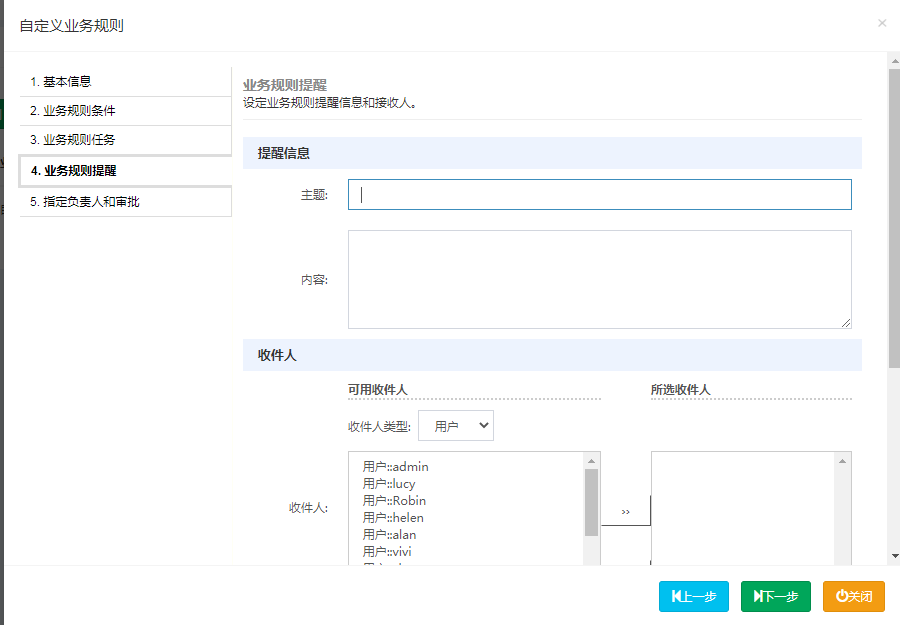 当规则提交后需要通知其他用户时选择对应的收件人,收件人会在系统右下角收到通知