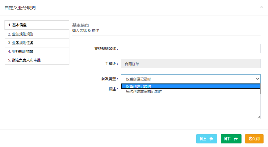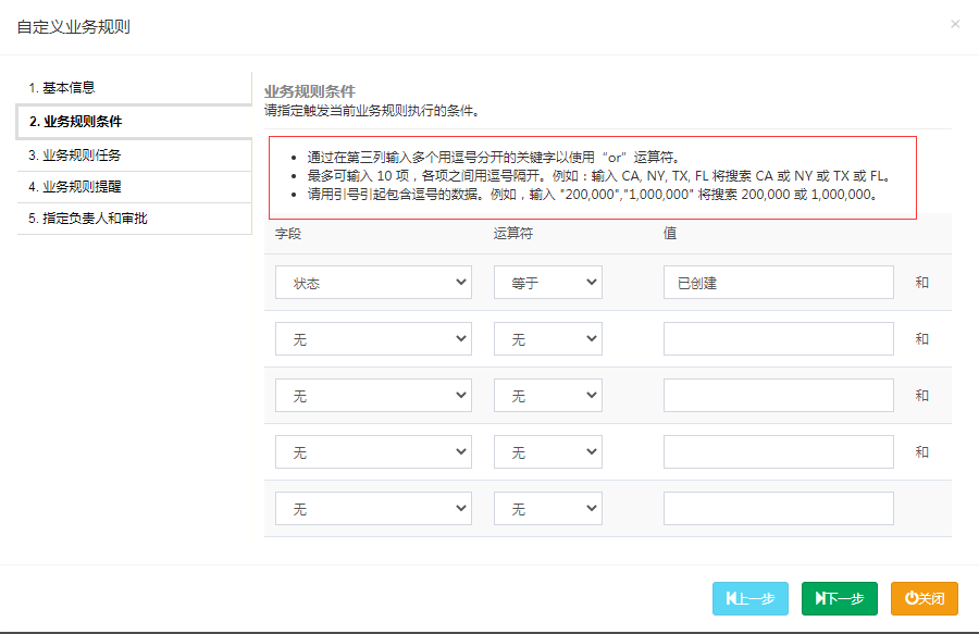 系统定制>业务规则,业务规则分为五个步骤
