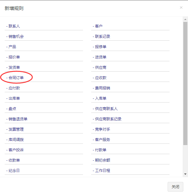 点击新增业务规则,弹出新增规则页面,选择需要建立规则的模块,例如:合同订单
