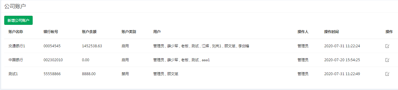 公司账户是公司的财务所在,对应 收款单、付款单,可以创建多个(只有管理员可以操作)