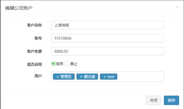 * 用户:勾选的用户才有权限使用公司账户,未勾选的用户不能使用公司账户。