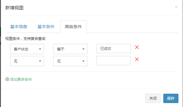 高级条件:当前视图若需要通过条件来筛选,可以增加一个或者多个条件,举例:条件选择“客户状态”等于“已成交”