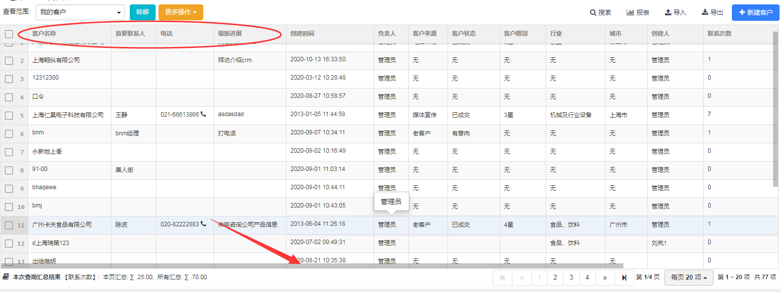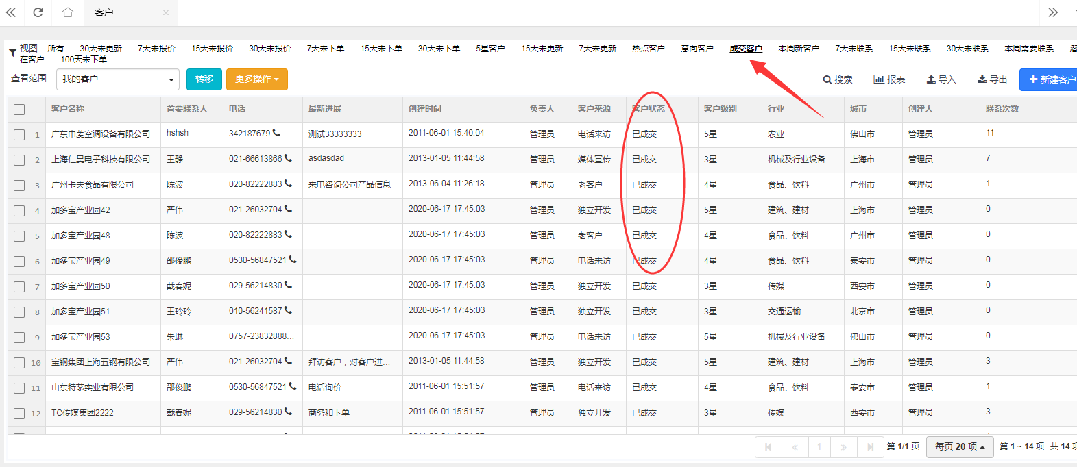 设置之后,点击查看“成交客户”视图时可以看到客户状态为已成交的信息在当前视图显示