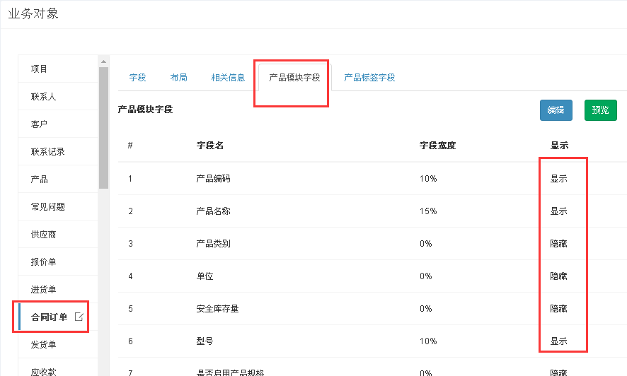 设置关联产品的模块中产品字段的显示与否,其中产品字段的顺序在 业务对象-布局 里面调整。