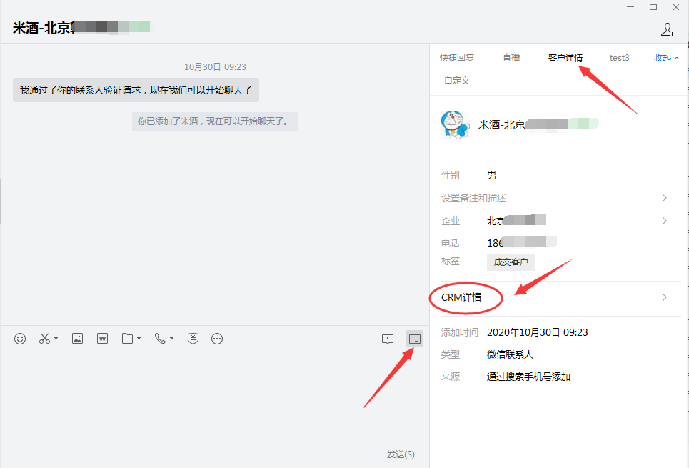 通过企业微信电脑端同样可以进入CRM客户详情,点击微信对话框右下角图标---点击客户详情\---CRM详情,展示如下